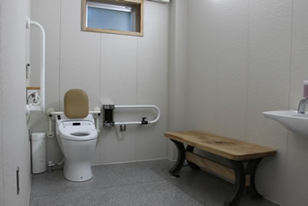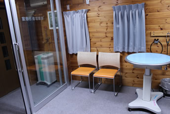 他のペットと一緒にいると落ち着かない、怯えてしまう時などには、どこでもお好きな場所でお待ちいただけます。また、駐車場待合室のトイレは車椅子で来院された飼い主様はじめ、大型犬とも一緒に入れるように、ゆとりをもって造ってありますので安心してご利用いただけます。