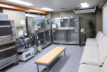 通常の手術室とは別に、麻酔設備や内視鏡設備等を備えた治療スペースもあり、簡易的な手術も安全に行えるようになっています。急患の際に複数の獣医師により同時進行で処置を行う事もでき、一般外科、整形外科、内視鏡手術、緊急診療を円滑に行える体制になっています。